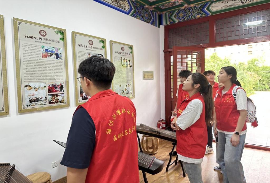 东流亭社区先后被评为“山东省文化生态名村”“非遗特色示范社区”“青岛市非物质文化遗产保护特色社区”,志愿者们前往东流亭社区的“竹庐书院”,该书院充分整合了青岛峄阳文化园、青岛峄阳文化产业街、峄阳竹庐非遗工坊等平台资源,志愿者们围坐箜篌艺人旁,聆听历史渊源与技艺精髓。在艺人指导下,亲身体验指尖翻飞,感受琴弦阵阵。团队细致调研了箜篌表演队组建历程、常态化运营模式,探索这项非遗技艺如何转化为文旅“金名片”,“敲响”村民增收致富的新乐章。学生们在工作人员引导下,参观了展示胡峄阳文化的各类展品,深入了解了胡峄阳的生平事迹、思想理念以及相关传说故事。此外,大家还参与了书院举办的传统文化活动,如书法体验、国学经典诵读等。