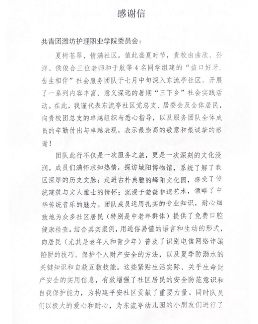 为引领和帮助青年学生在社会实践中受教育、长才干、作贡献,助力健康中国建设,7月14日至16日潍坊护理职业学院“益口好牙,齿生相伴”社会实践服务队深入城阳区东流亭社区,依托专业特色,围绕口腔保健、防诈骗宣传、探寻非遗文化、康养生活等方面,开展义诊宣教科普和调研活动。