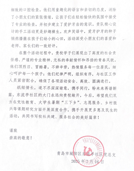 口腔系团总支与流亭街道办事处团工委共同签订《校地共建合作协议》,下一步,双方将在志愿服务、人才培养以及资源共享方面开展深度合作,包括联合打造特色志愿服务品牌、定期组织大学生实践团队进驻开展社会实践活动,为推动高校智力资源与社区发展需求精准对接,实现乡村振兴奠定了基础。