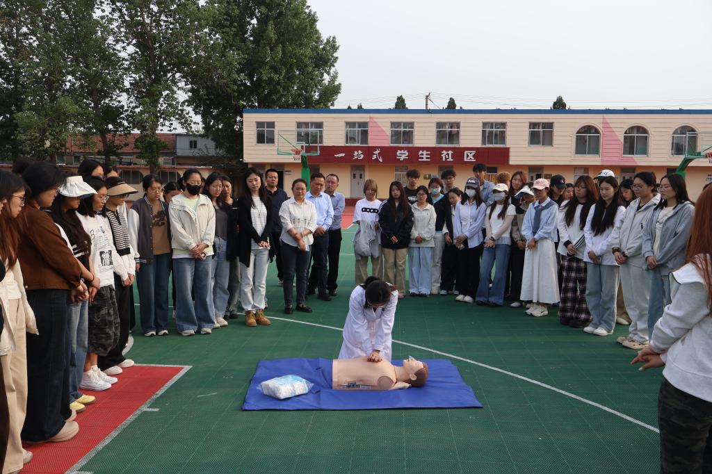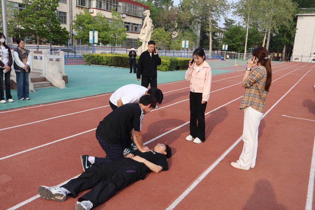 专题讲座结束后,口腔系在操场组织开展了突发心脏骤停事件紧急就医应急演练。演练由口腔系教职工、学生代表联合附属医院、安全保卫处、学生工作处、后勤保障与社会服务处等部门共同完成。场景模拟一名学生在课后活动期间突然倒地、意识丧失,演练按照“第一发现人响应—校内应急响应—专业急救介入—转运衔接—总结复盘”五个阶段有序推进。参演学生沉着判断患者意识与呼吸,立即启动胸外按压与人工呼吸,严格遵循30:2的按压通气比操作,按压深度、频率及胸廓回弹等指标均达到评估标准。附属医院急救团队快速抵达现场接管,完成持续心肺复苏、药物给药及转运准备;辅导员同步联系家长并安排陪同就医,体现人文关怀。演练结束后,总指挥进行点评,急救专家曹晓晓老师对心肺复苏操作细节进行了现场复盘与讲解。此次演练有效检验了《紧急就医方案》的可行性,强化了师生“敢按、会按”的急救实操能力。