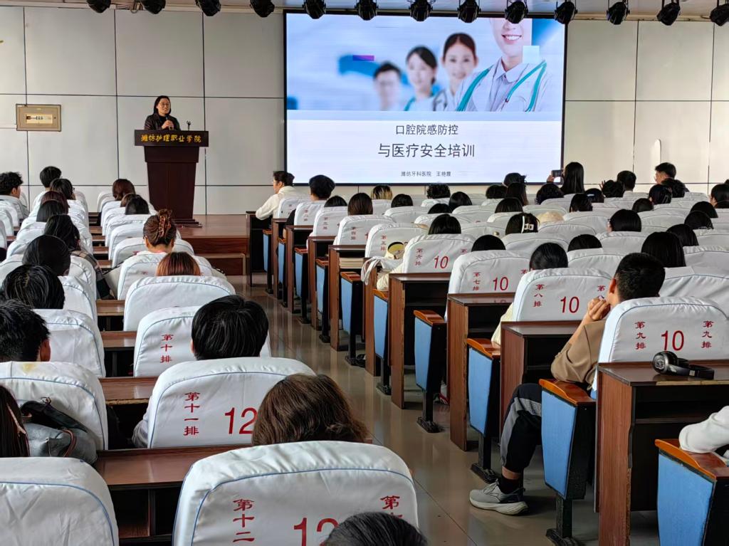 当日下午,口腔系特邀潍坊牙科医院护士长兼院感管理负责人王艳霞,在综合楼报告厅为口腔医学专业同学及教师代表带来《口腔院感防控与医疗安全》专题讲座。王艳霞护士长结合二十余年口腔护理与院感控制经验,系统讲解了口腔院感概述、核心防控措施、医疗安全与风险防范等内容,重点强调了手卫生、器械消毒灭菌、气溶胶管理、医疗废物处置等关键环节,并围绕职业暴露处置、患者隐私保护、医疗数据安全等实际风险点,提醒同学们在实习与未来工作中严守规范、防微杜渐。讲座现场互动积极,同学们纷纷表示,通过本次学习进一步筑牢了“安全无小事”的责任意识。