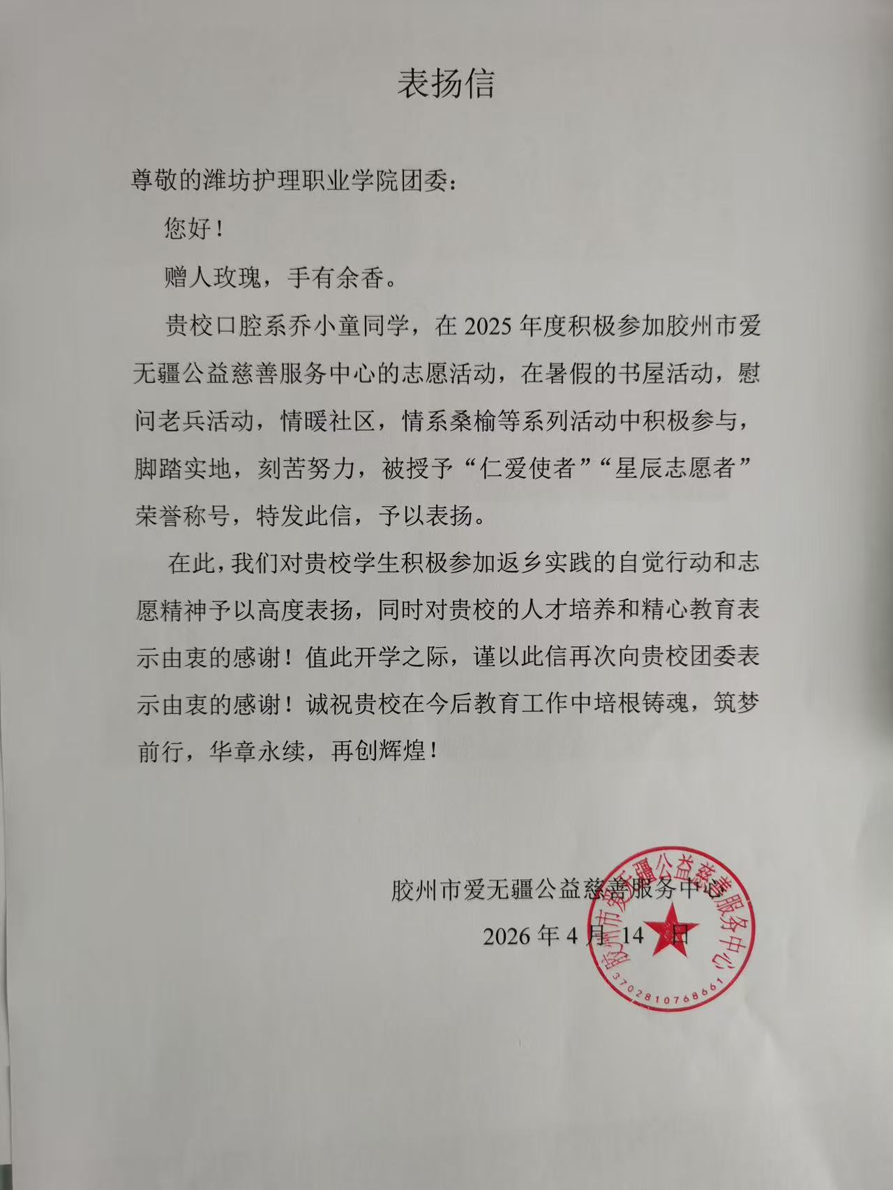 近日,胶州市爱无疆公益慈善服务中心向潍坊护理职业学院团委发来表扬信,对学院口腔系2024级医学美容技术5班学生乔小童在2025年度积极参与各类公益志愿活动的突出表现给予高度赞扬。